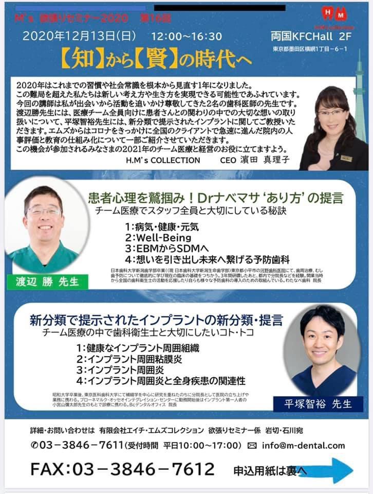 12月13日(日)に、H・M’S COLLECTION様主催のセミナーにてインプラントについての講演をさせていただきました。ご参加いただきました皆様、誠に有難うございました。少しでも、お役立ちできれば幸いです。